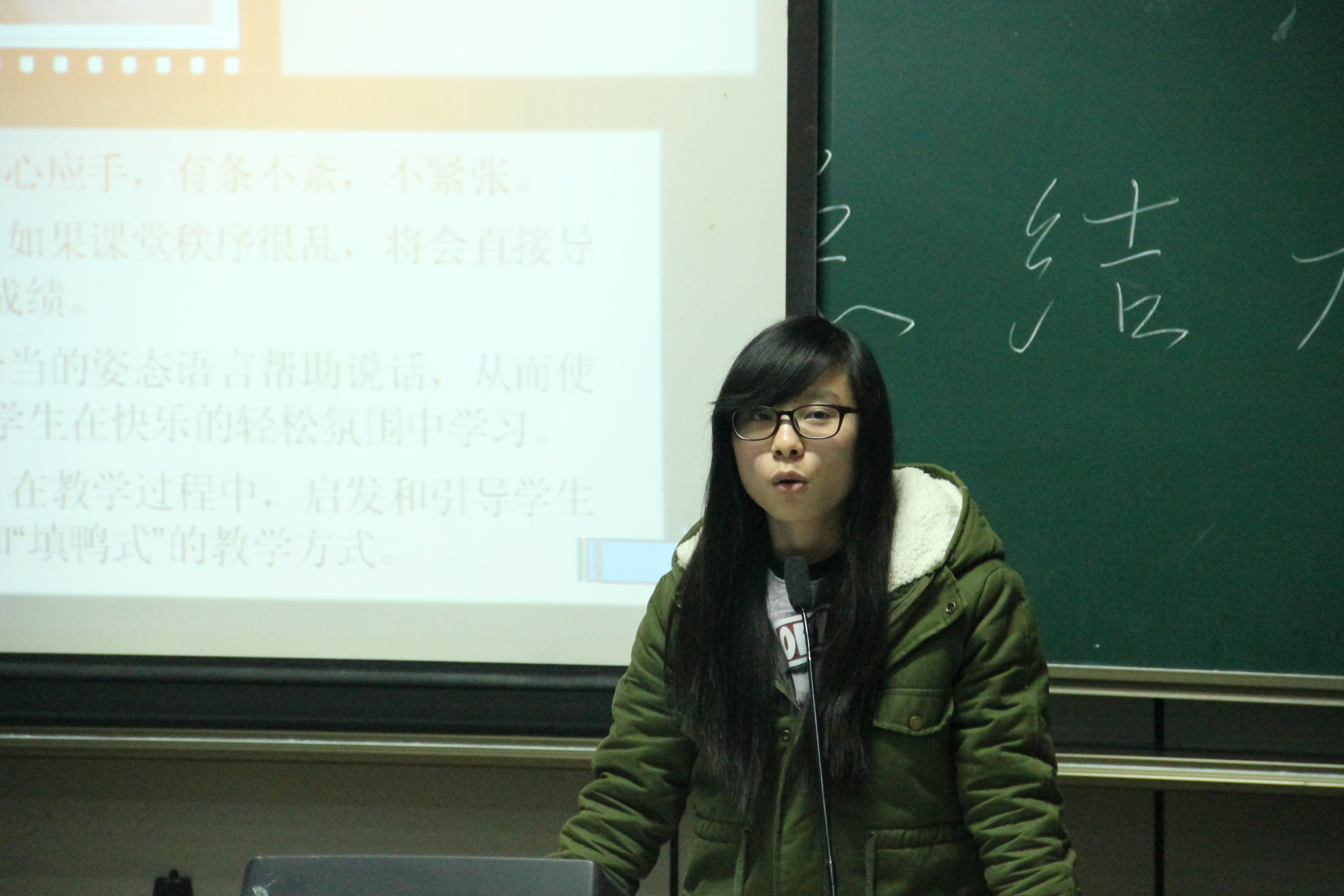 小结过后,长兴中学代表董辉讲述了他们小队辛苦而不简单的工作,分享了自己对于实习的感受;紧接着,杭州十三中实习小队代表沈嘉明通过自己的设想与现实情况的对比,以幽默诙谐的语言强调了“三分教学,七分管理”的不易,给在座同学流下了深刻的印象;代表余杭高级中学实习小组的郑钧茹落落大方、口若悬河,从教学工作和班主任工作两个方面论述了教学中应该注意的几个要点,令同学们受益匪浅;最后上台的下沙中学代表赵炯同样从这几个方面加以详细说明,点明实习对于自身的作用和影响。
