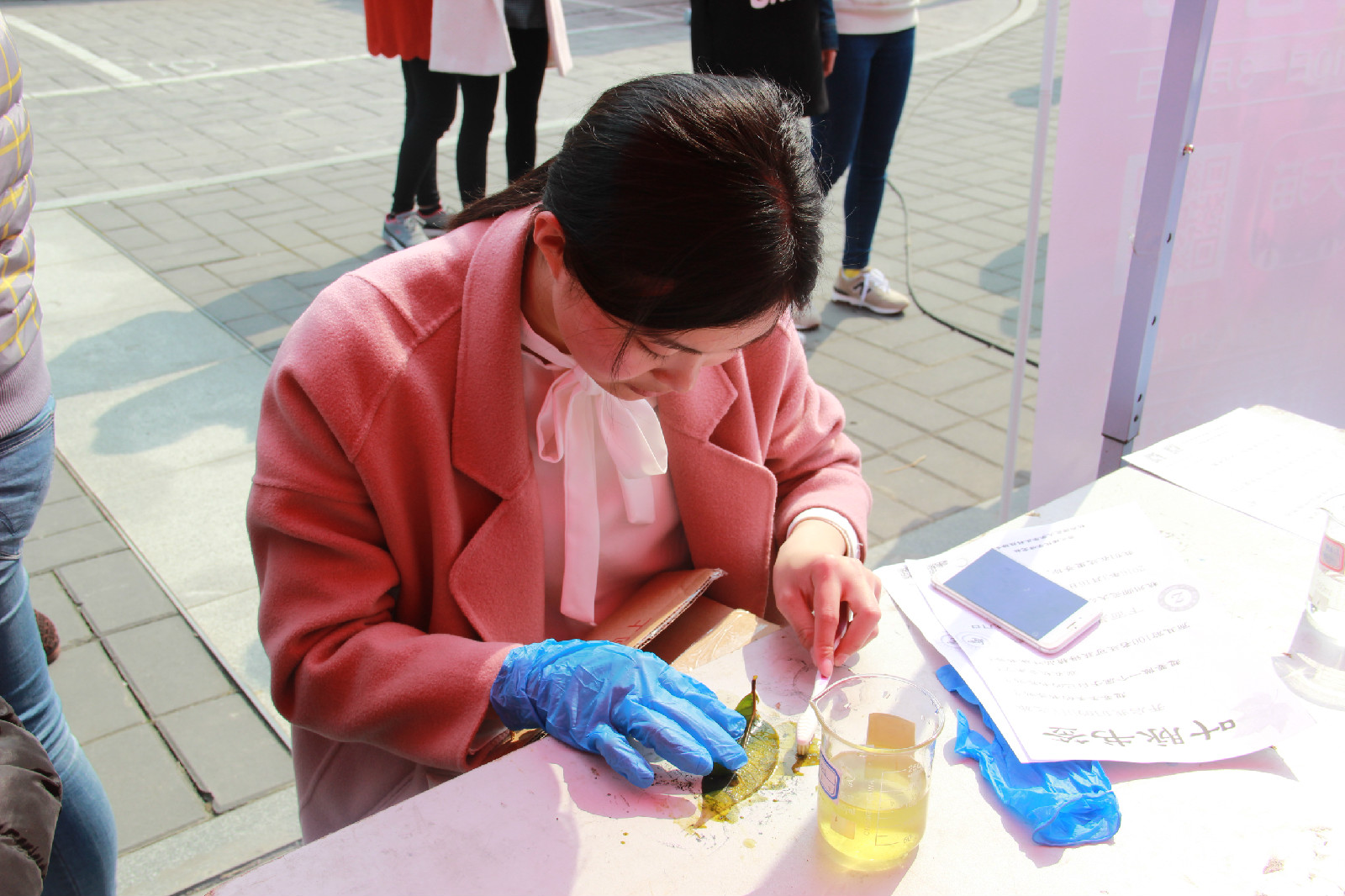 活动还未开始,就有许多同学怀着好奇心涌了上来,工作人员也耐心地回答同学们提出的问题。14:30,活动准时开始,桌边立刻坐满了跃跃欲试的同学。由于很多同学都是第一次尝试做叶脉书签,他们也格外小心谨慎,唯恐破坏了曼妙轻柔的树叶。刷完树叶后,同学们各自挑选了心仪的纹身贴与叶脉一起塑封,永久地保存下这份美好记忆。结束制作后,参与的同学都心满意足地带着专属于自己的叶脉书签和工作人员道别。除此之外,参与本次活动的前100名同学还幸运地获得了精品书签。