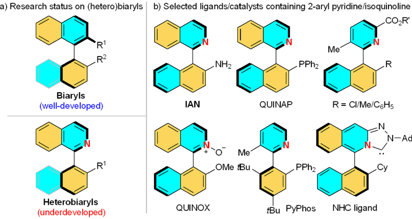 目前,针对轴手性化学的研究越来越受到化学工作者们的青睐,特别是基于联苯及联萘型两类联芳基轴手性化合物的不对称构建,已有大量文献报道。然而, 与之形成鲜明对比的是,含吡啶、异喹啉等芳杂环的轴手性骨架的催化不对称构建却发展缓慢,是该研究领域亟待解决的难题。