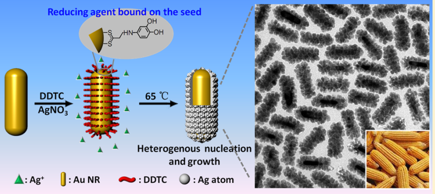前期,黄又举教授团队对贵金属纳米粒子精准合成,制备出超过30种单分散的纳米粒子。其中通过对纳米金棒(Au NRs)表面还原剂配体的修饰和Ag+沉积方式的调控,可实现玉米状Au/Ag NRs核壳超结构纳米粒子的构建(如上图所示)。有意思的是,通过调控Ag+的用量,可以实现核壳超结构纳米粒子从NIR-Ⅰ到NIR-II的吸收波长连续可调控(Langmuir 2017, 33, 5378−5384)。
