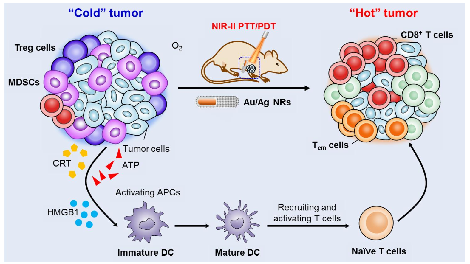 基于玉米状Au/Ag NRs核壳超结构纳米粒子在NIR-II的光学性能,黄又举教授团队与杨显珠教授团队合作,调控玉米状Au/Ag NRs核壳超结构Ag的厚度,实现等离子吸收峰在1064 nm处的精准可控。在1064 nm的激光照射下,Au/Ag NRs可以产生热以及活性氧,其诱导肿瘤细胞产生免疫原性细胞死亡(Immunogenic Cell Death,ICD)。在体内,该Au/Ag NRs能通过这种ICD效应,促使从“冷”肿瘤向“热”肿瘤转变,从而增强免疫检查点阻断抗体疗效,在远端模型、转移模型以及记忆模型中都显示出良好的功效,为提高免疫检查点阻断抗体的疗效提供策略。