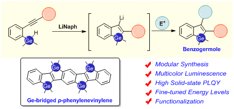 有机π共轭分子具有丰富可调的物理化学性质,对分子材料与器件、生命科学研究具有重要意义,近年来呈现出蓬勃发展的势头。将杂原子如B、N、O、Si、P、S等引入到共轭骨架中是调控电子结构和创造新物质的重要途径之一。由于硅具有空3d轨道,可形成特殊的σ*-π*相互作用,含硅π-共轭体系在过去二十年中受到了极大的关注。相关研究促进了有机硅化学的发展,推动了有机硅材料在国民经济各行业门类中的广泛应用。作为同主族元素的类金属锗,其具有较大电负性和原子半径,在共轭体系中引入锗能够改善功能分子的溶解性、可加工性,改变分子堆积,影响电子结构和激发态性质等。然而,因锗杂共轭体系的构建方法有限,严重限制了其结构多样化和物理化学性质研究。