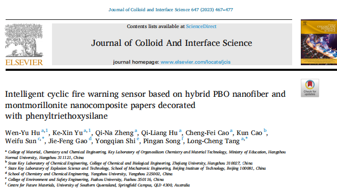 近日,我校真人百家乐 汤龙程教授团队设计研发的一种纳米复合材料在循环阻燃智能预警等方面取得新进展,相关研究成果以题为“Intelligent cyclic fire warning sensor based on hybrid PBO nanofiber and montmorillonite nanocomposite papers decorated with phenyltriethoxysilane”发表于国际知名期刊Journal of Colloid and Interface Science(IF=9.965)上。