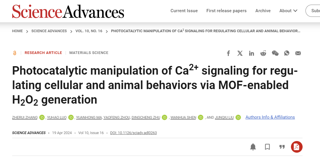 近日,杭师大材化真人百家乐 刘俊秋教授团队/生环真人百家乐 沈万华教授团队携手合作,在生物Ca2+信号激活的交叉研究领域取得突破性进展,相关研究成果以题为“Photocatalytic manipulation of Ca2+ signaling for regulating cellular and animal behaviors via MOF-enabled H2O2 generation”发表于Science子刊Science Advances(IF = 13.6)。