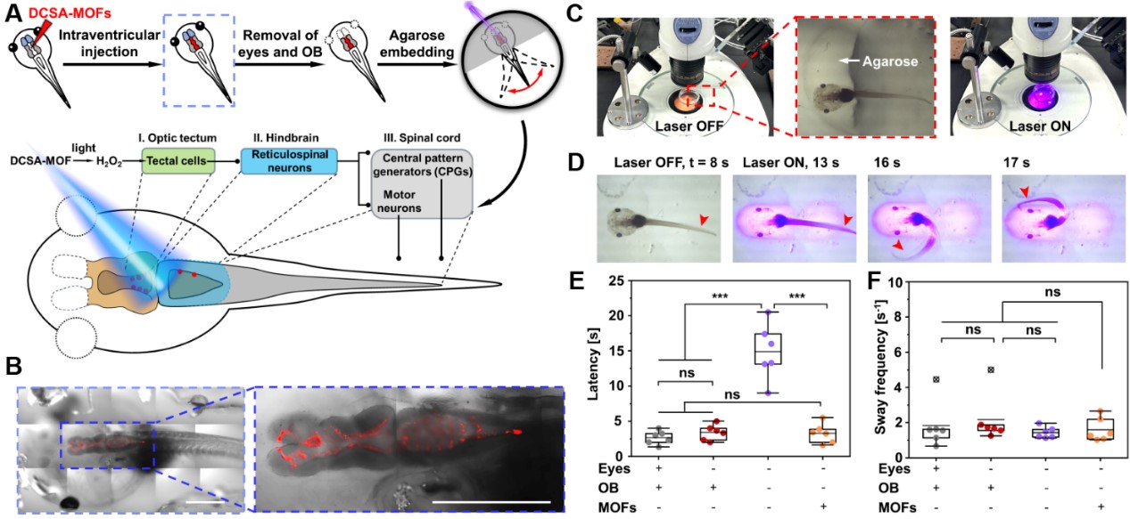 在此基础上,研究者们使用DCSA-MOFs成功使致盲的白化非洲爪蛙蝌蚪恢复对光照的感知。在脑室注射DCSA-MOFs后,通过光催化产生H2O2成功激活了视顶盖神经元,模拟了视觉信号的输入。视顶盖神经元将信号投射到后脑和网状脊髓神经元,并进一步激活脊髓中的运动神经元和中枢模式发生器来控制蝌蚪的尾部运动。将蝌蚪的头包埋在低熔点的琼脂糖后用405 nm激光照射,可以观测到蝌蚪尾巴开始摇摆。通过测量反应延迟期、摇摆频率和持续时间参数来评估蝌蚪的光照回避行为。当去掉双眼和嗅球时,平均延迟期约为14.9 s,明显长于对照蝌蚪(约2.7 s)和没有眼睛的蝌蚪(约3.4 s)。令人兴奋的是,在没有眼睛和嗅球的蝌蚪中,DCSA-MOFs显著地将反应延迟时间降低到正常水平(约3.3 s)。因此,研究者成功地利用激光照射来控制蝌蚪的视觉回避行为。