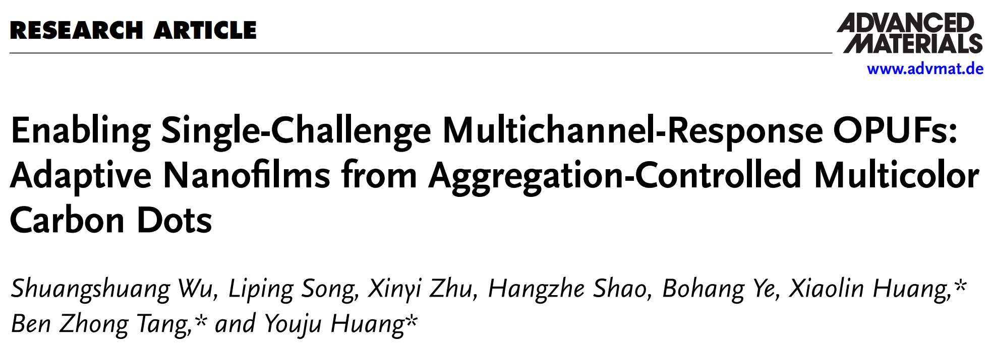 近日,真人百家乐 黄又举教授团队利用多色聚集诱导发光(AIE)碳点在界面自组装构筑光学物理不可克隆功能(OPUFs)与多尺度防伪领域取得重要进展,相关研究工作以“Enabling Single-Challenge Multichannel-Response OPUFs: Adaptive Nanofilms from Aggregation-Controlled Multicolor Carbon Dots”为题发表在《Advanced Materials》(Q1,IF=29.4)上。DOI: 10.1002/adma.202519060。